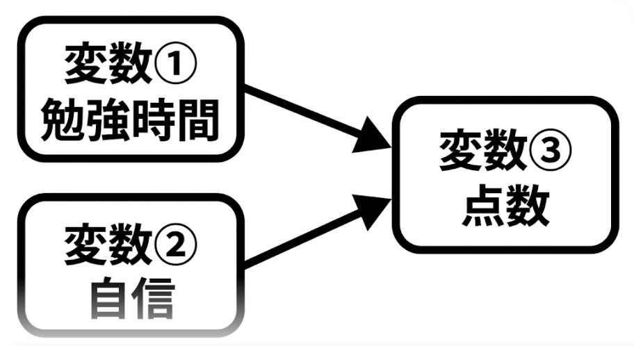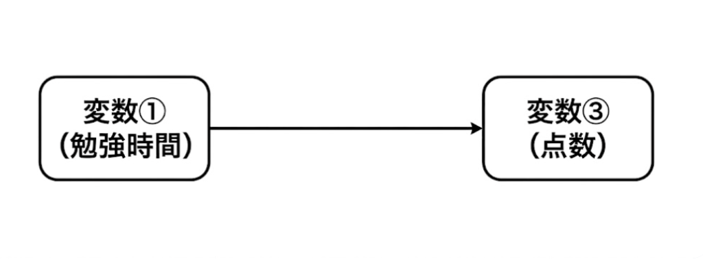 しかしながら、変数①(勉強時間)が変数②(自信)につながり、その結果変数③(テストの点数)に影響を及ぼすという経路も考えられます。
