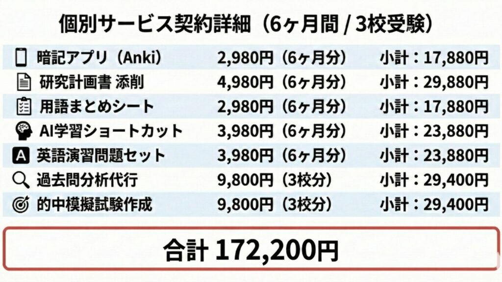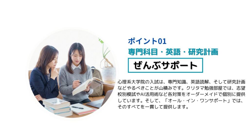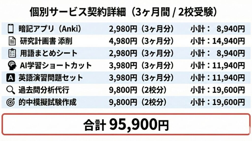 【低価格×ストレスフリー】オール・イン・ワンサポートで合格を目指しませんか? X Facebook はてブ LINE コピー 2026.01.08 製品ラインナップは↓↓こちら(=゚ω゚)ノ Ankiアプリ 心理英語 研究計画添削サービス 用語まとめ(100字-300字) 過去問分析代行 志望校別模擬試験 AIによる学習ノウハウ 論述対策(準備中) 例えば・・・ こんなに違うんです!