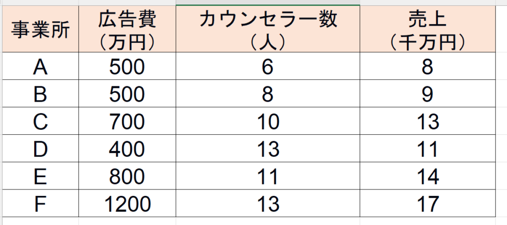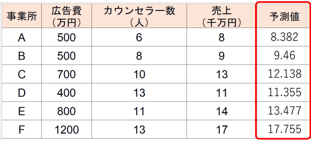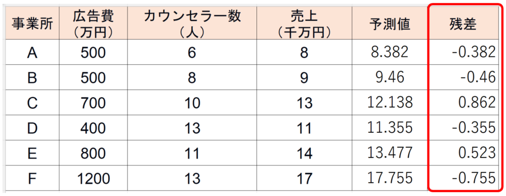 ここでの従属変数は「売上額」でしたから、事業所Aの場合・・・