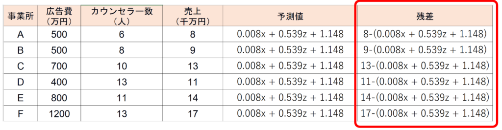 これは先程のデータに5列目を増やし、先程の重回帰式にデータの値を代入して具体的な値を求めた表です。