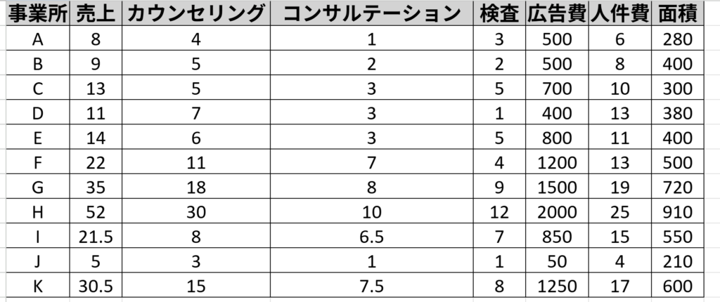 このデータは、【アドインを使って重回帰分析をやってみよう】で扱ったデータに事業所G-Kが加わったものです。