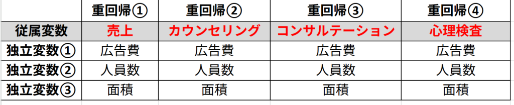 - 独立変数を固定、従属変数を変動させるパターンでは、同じ独立変数で複数の従属変数を分析する