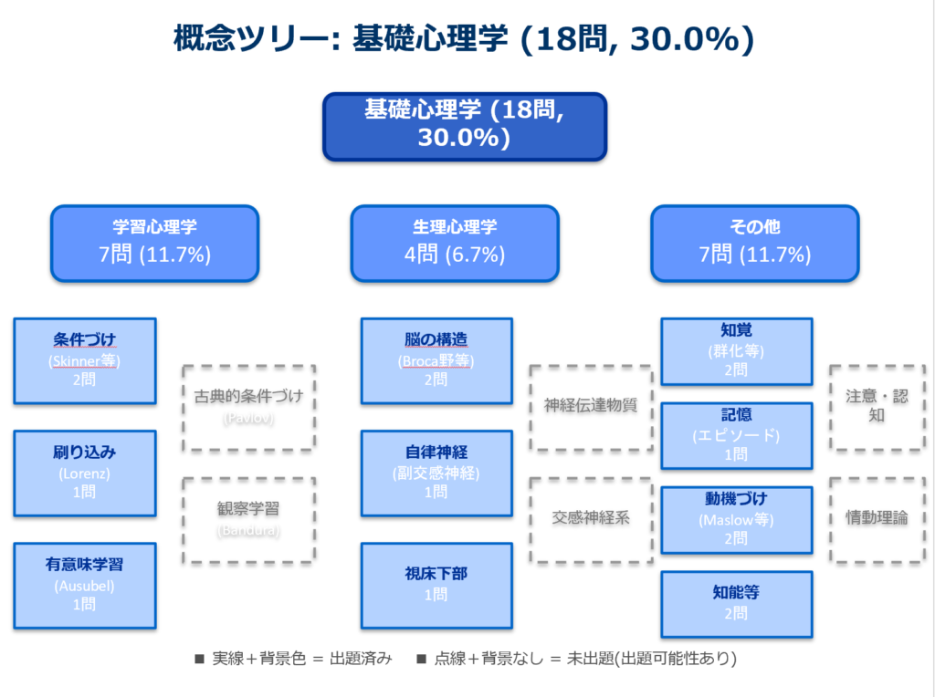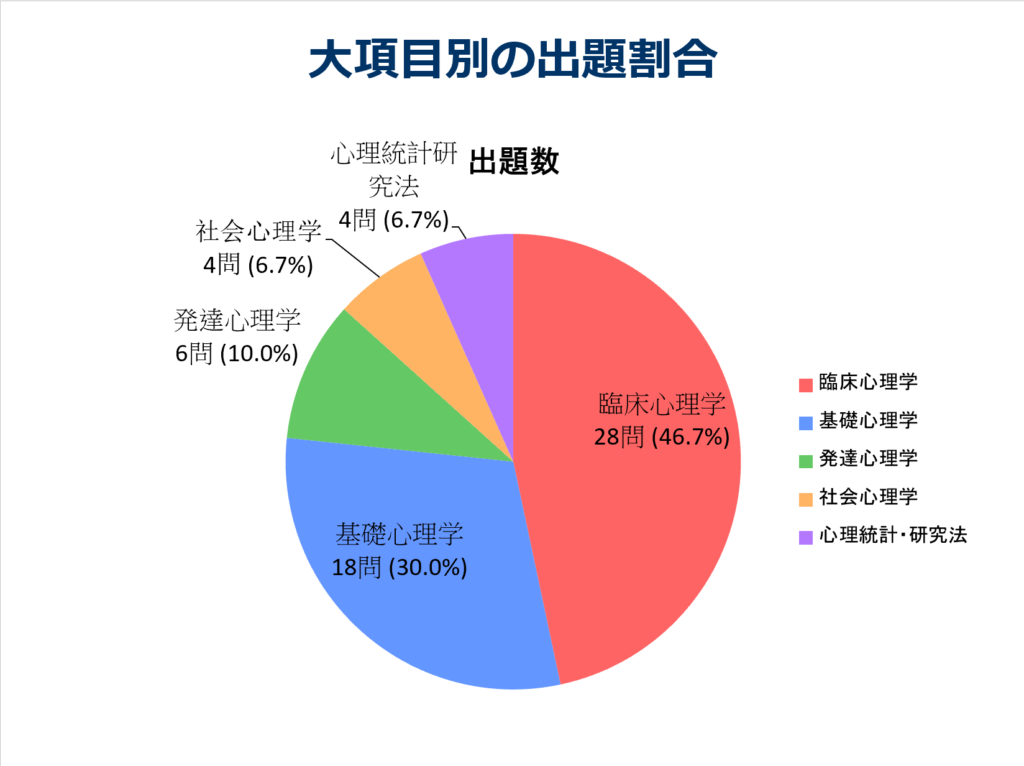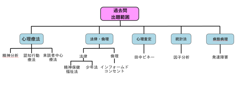 このように、全問題を大項目(例:法律、心理療法、統計、倫理など)と小項目(例:少年法、精神分析、因子分析など)に分けて整理するのです。