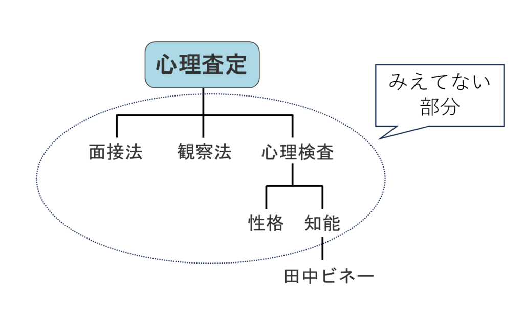 なぜなら、「査定」というのは、クライエントを理解するための営みであり、そこには「面接法」とか「観察法」とか、色々あって、その中の1つに「検査」があり、さらに、検査には「性格」を測定するものや、「知能」を測定するものがあって、田中ビネーは、知能を測定する検査の1つだからです。