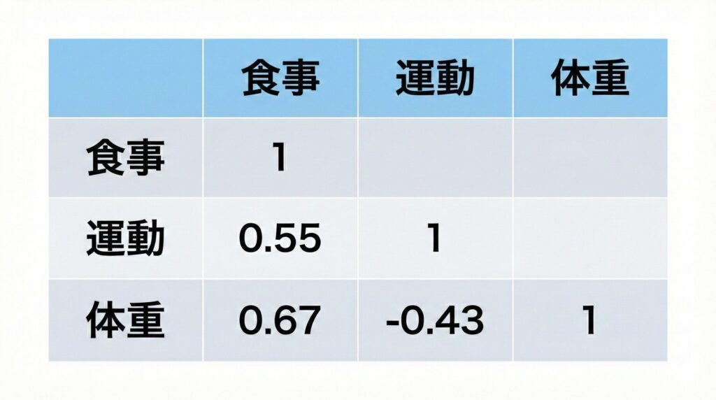 3. 運動と体重で負の相関運動が増えると体重が減る