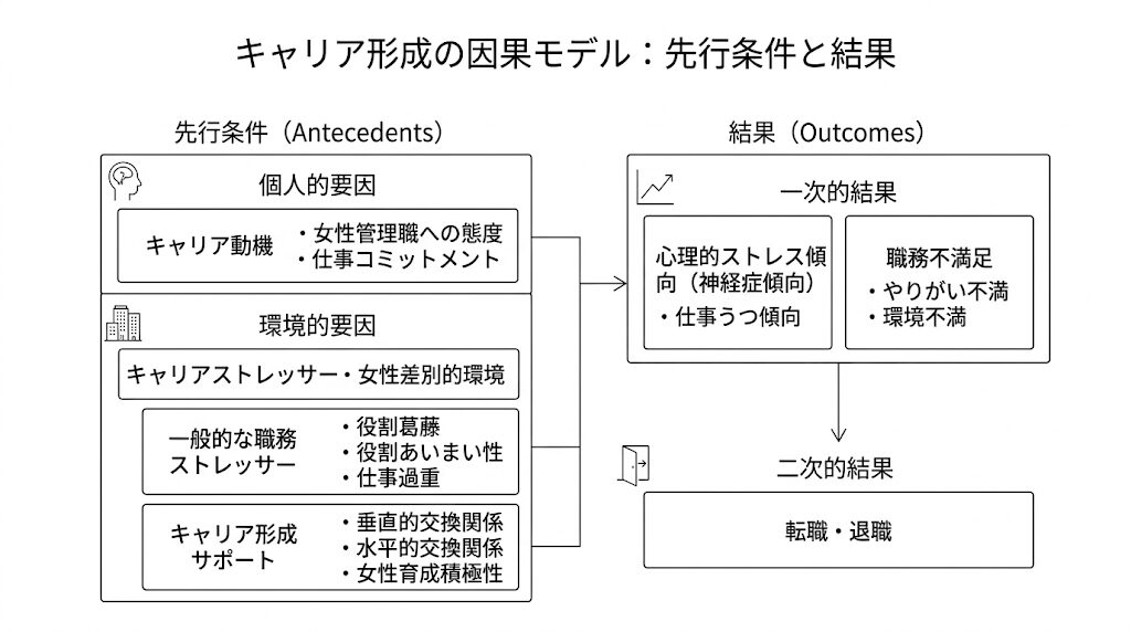 - 間接的な経路:「キャリアストレッサー → キャリア動機 → 一次的な結果」