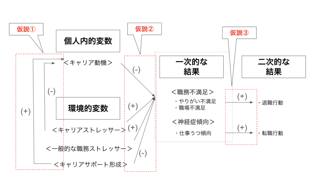 (引用:働く女性のキャリア・ストレス・モデル-パス解析による転職・退職行動の規定要因分析、p15、右列、[パス解析による因果関係の検討] 1-3行目)
