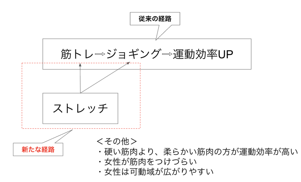 しかし、女性の場合、男性に比べて筋力がつきづらいため、それよりもストレッチで可動域を広げた方が運動効率が高いとも言われていたとします。