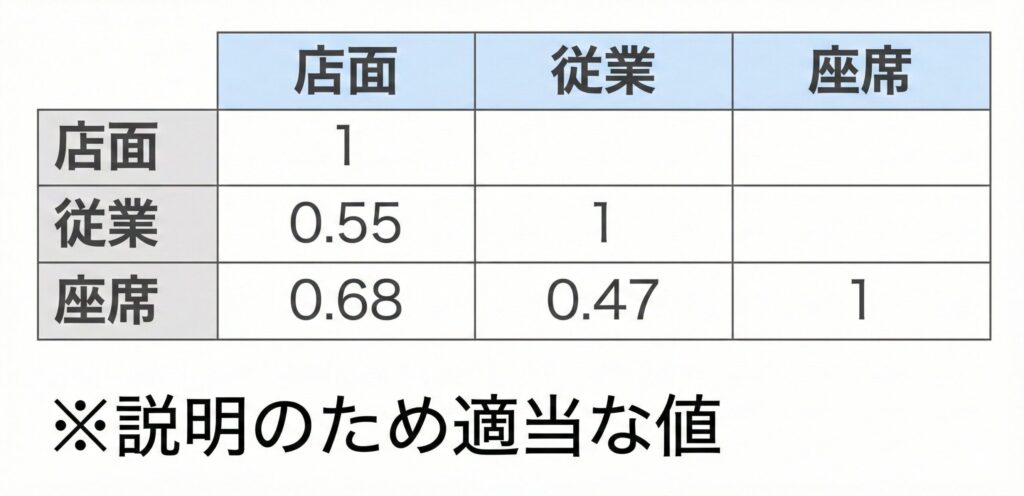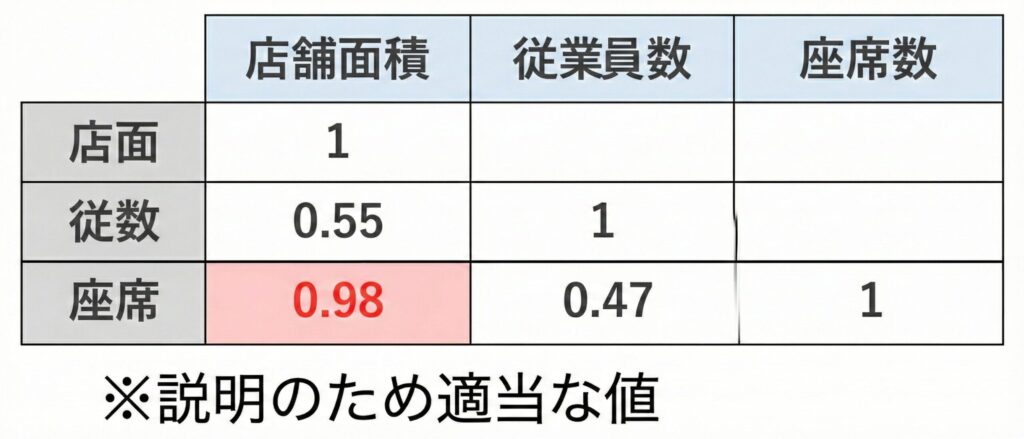 この表を見ると、店舗面積と座席数の相関係数が「0.98」と極めて高くなっています 。