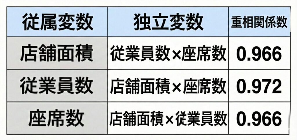 に対して、店舗面積と従業員数を独立変数、 座席数を従属変数として重回帰分析を行い 実測値と予測値の相関係数を求めるというこ と
