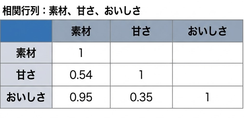 - 相関係数(素材を考慮しない場合): 甘くなるほどおいしい。